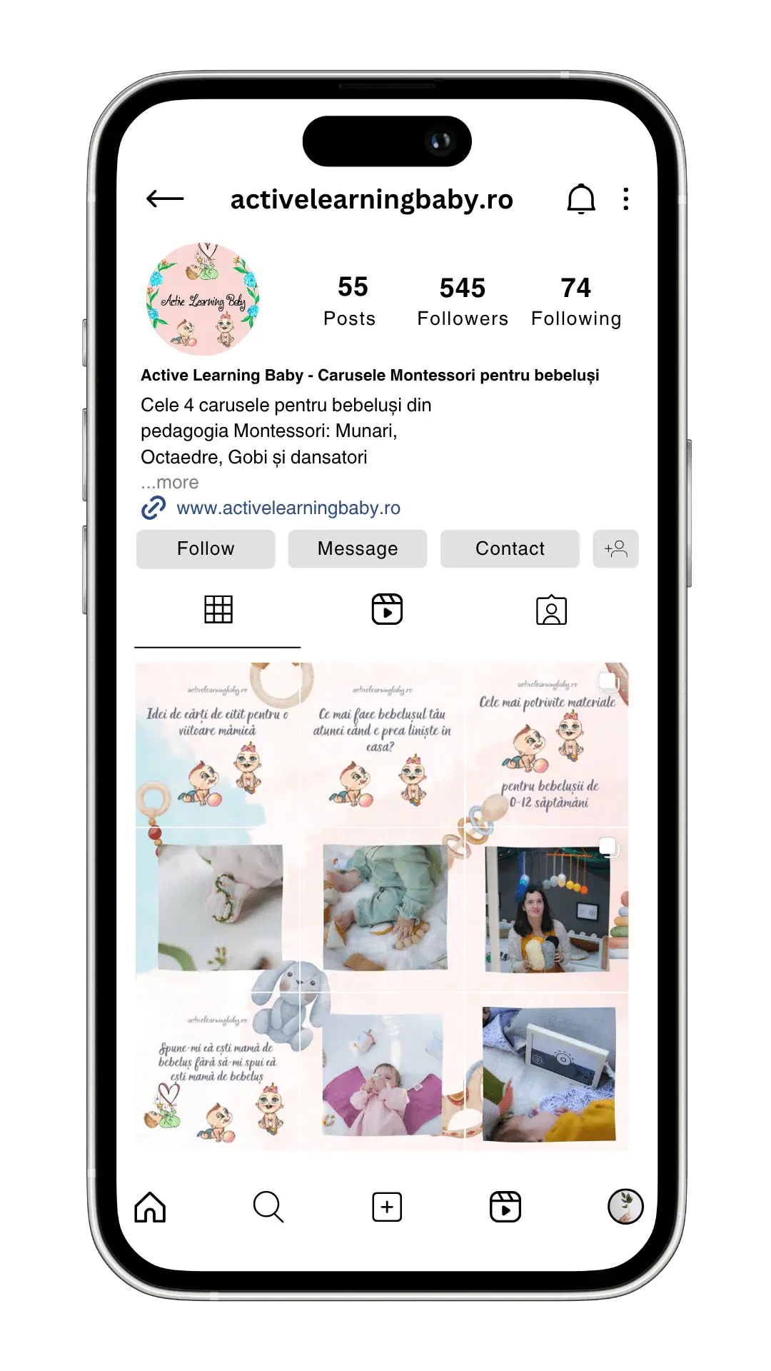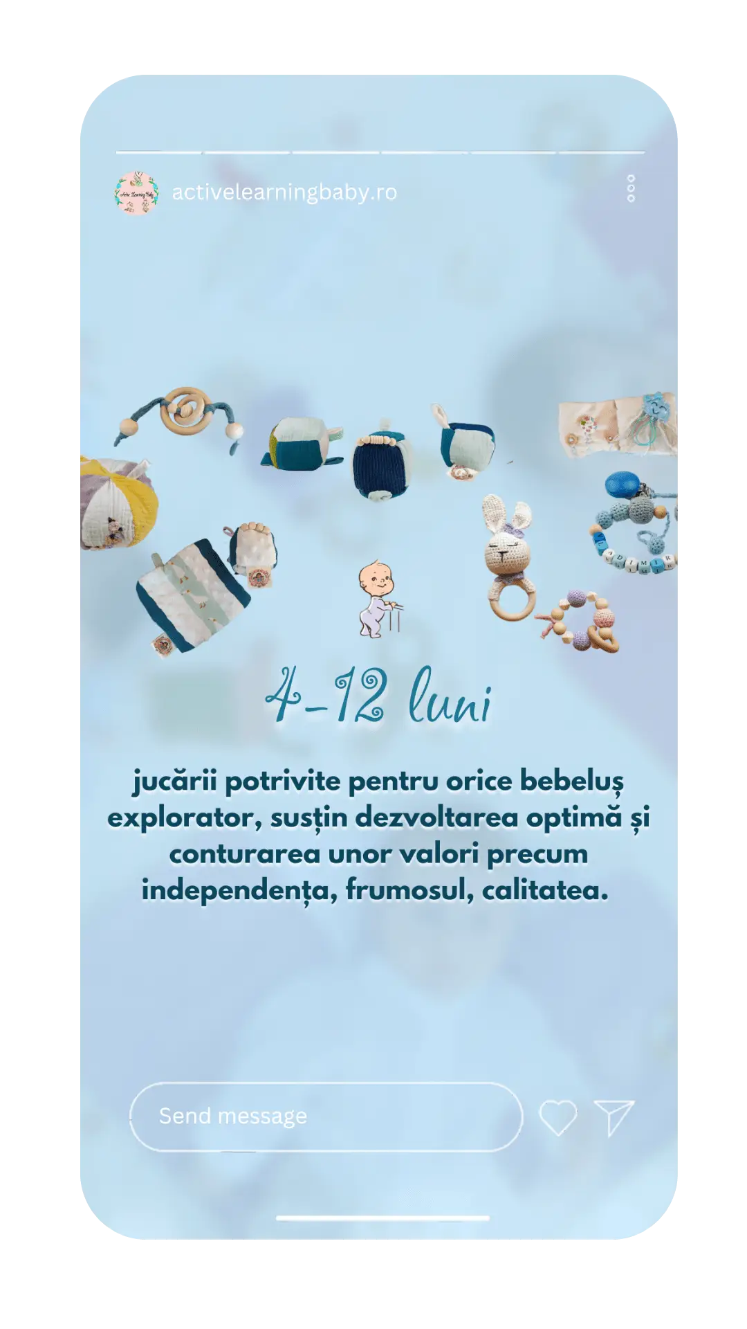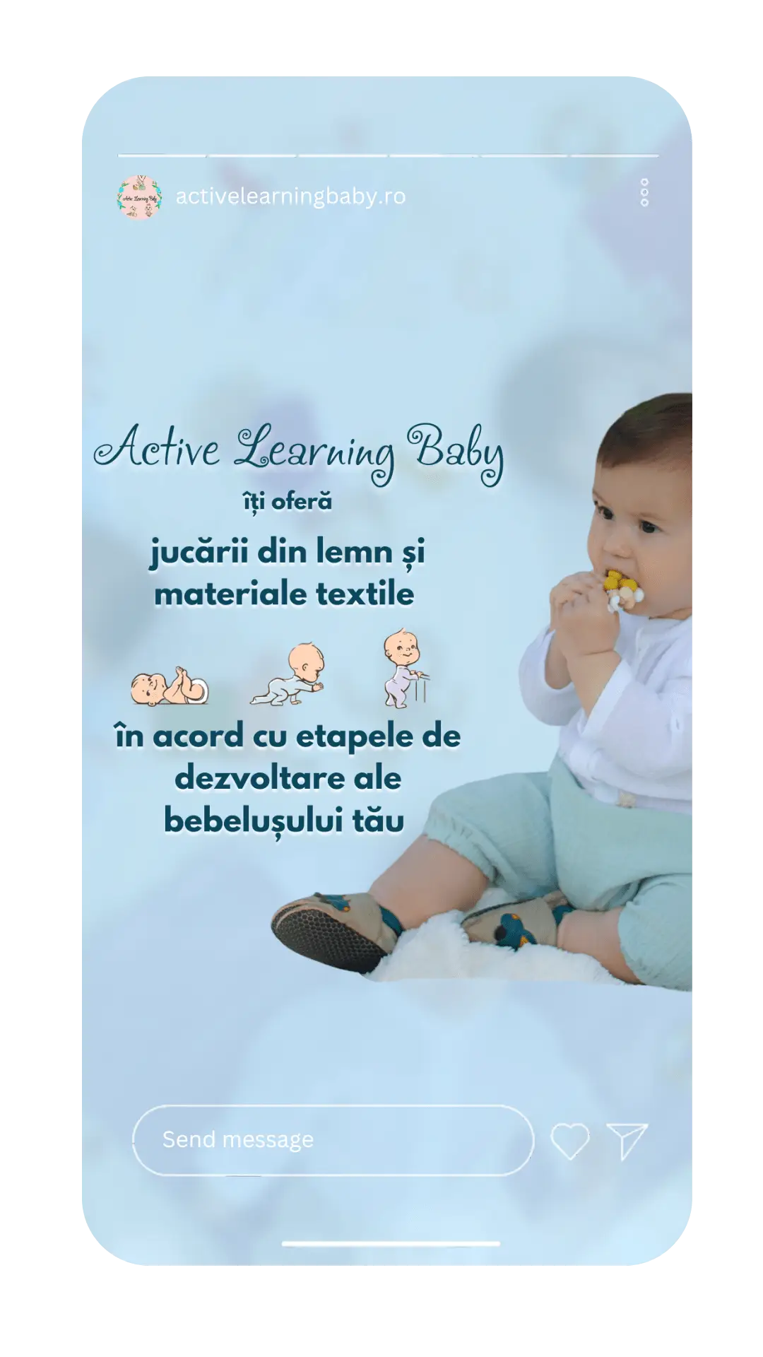 Pentru Active Learning Baby, am dezvoltat o comunicare vizuală prietenoasă și educativă, perfect adaptată universului părinților și copiilor mici. Am realizat fotografii de produs și content video cu focus educațional, punând în valoare funcționalitatea jucăriilor și conceptele de parenting activ. Vizualurile au fost integrate într-un feed personalizat, iar grafica a susținut brandingul prin materiale precum rollup-uri, flyere și carduri informative. Am crescut o comunitate activă de mămici pe Instagram, TikTok și Facebook, oferind conținut de calitate și interacțiune reală, într-un spațiu cald, empatic și bine structurat.